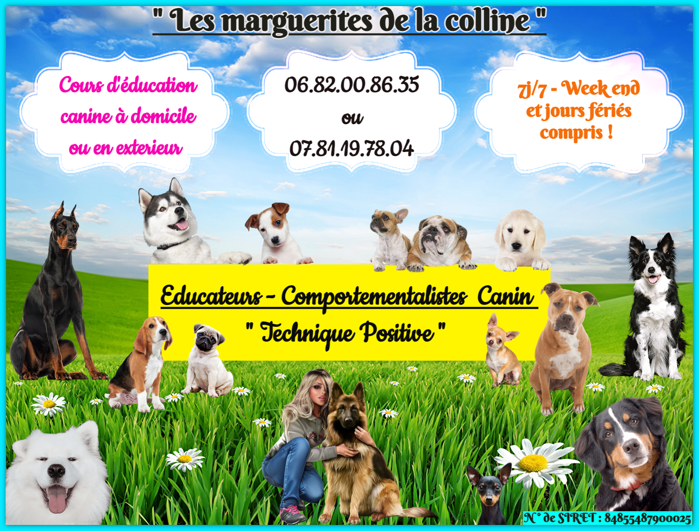 Educateurs / comportementalistes canins (Technique positive), et pour toutes les races de chiens, mais aussi éleveurs canins, nous vous proposons des cours d’éducation, à domicile ou en extérieur, vous pourrez choisir parmi de nombreux forfaits, et cours à l’unité, ce qui conviendra le mieux à vos besoins concernant l’éducation de votre chiot ou de votre chien, n’hésitez pas à nous demander conseils, pour effectuer votre choix, nous serons ravis de pouvoir vous guider dans celui-ci.